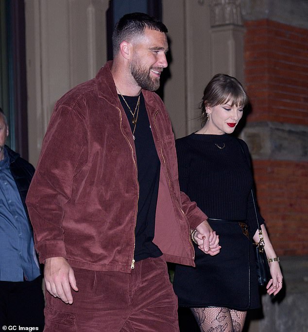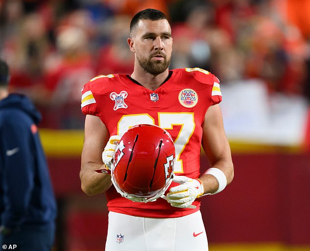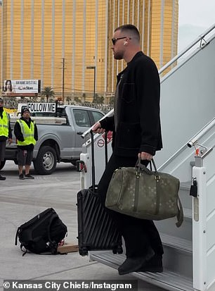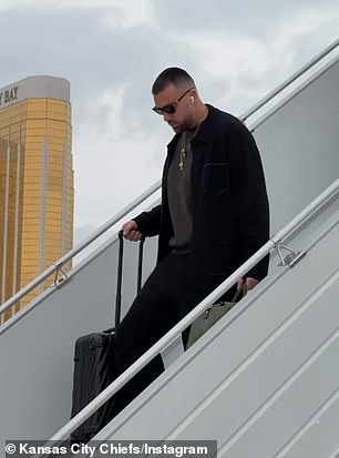 Kelce was seen stepping off the team’s private flight on Saturday afternoon, appearing relaxed and casual in a black co-ord and a khaki sweater. With his sunglasses on, he gave little away as he made his way to the bus waiting on the tarmac, listening to music.