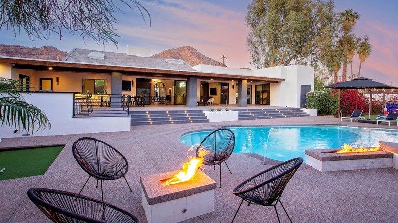 The Manor on Camelback in Phoenix is a contemporary home designed for the ultimate staycation. Spanning 7,500 square feet, it includes two living areas, a full kitchen, and a dining room. With seven bedrooms and bunk beds, it can accommodate up to 16 guests. The space opens to a patio overlooking outdoor areas with bocce and mini golf putting areas.