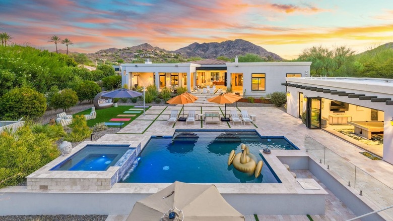 The open-plan living area includes two sections for socializing, a comprehensive kitchen, and a spacious dining area. A custom wall feature houses a billiards table, and the backyard features an infinity pool and a putting green. Nearby Scottsdale offers restaurants, hotels, and art galleries, along with spa resorts, golf courses, and hiking trails.